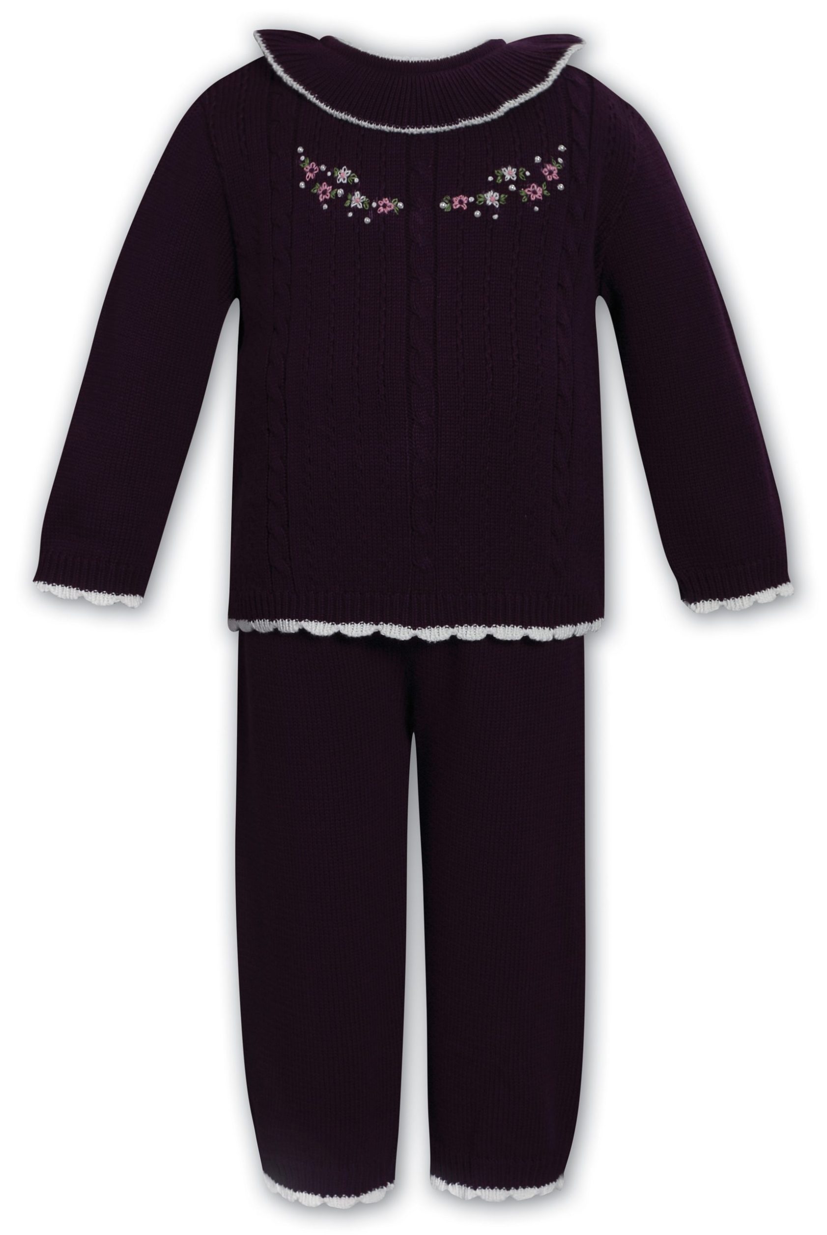 Embrace timeless style and delicate detail with this beautiful baby girls 2-piece knitwear set. Designed in 100% soft cotton, this set offers gentle comfort and warmth for cooler seasons. The knitted top features exquisite cable knit patterns and intricate hand-embroidered floral motifs across front. A pretty ruffled collar and subtle scalloped trims in soft contrast hues complete the classic look.